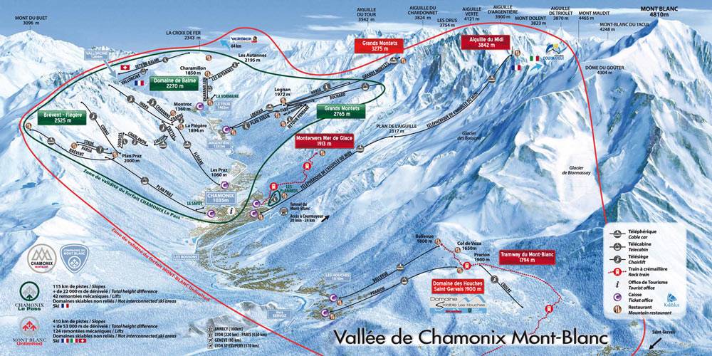 - Шамони — очень старый высокогорный курорт, который находится на высоте 1200–2000 метров. Здесь проложено 70 трасс для любого уровня сложности — от синего до черного. Самый длинный и достаточно экстремальный маршрут составляет по протяженности 22 километра. Туристов обслуживают бугельные, кабиночные, буксировочные и кресельные подъемники, а также фуникулеры.
