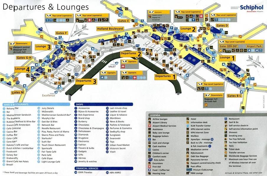 — Аэропорт Амстердама относится к числу лучших в Европе. У услугам следующих через этот аэропорт туристам, включая транзитных, предоставляется множество различных сервисов, а также развлечений. К примеру, игровая детская площадка, казино, возможность съездить в город на экскурсию и пр. Карта Аэропорта Схипхол помогает путешественникам отыскать необходимые им объекты, расположенные на территории аэропорта.