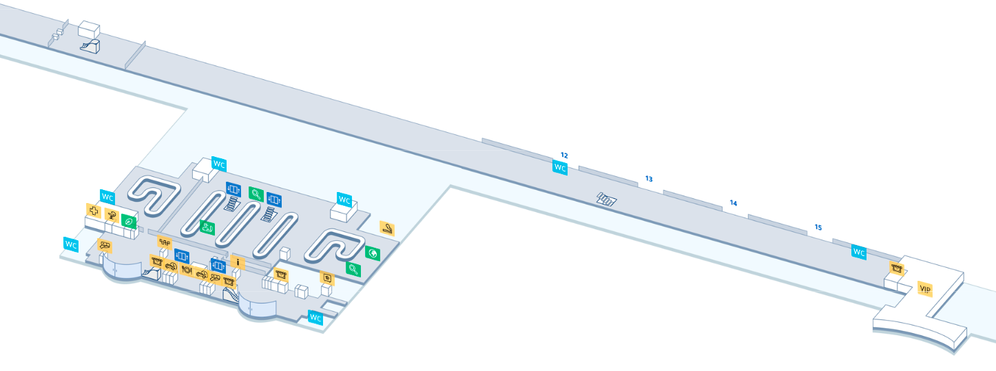 - Комната матери и ребенка – на втором этаже терминала, три комнаты для пассажиров с детьми – на третьем этаже в зоне вылета. Комнаты оснащены удобной мебелью и столами для пеленания. Также на третьем этаже находится детская игровая зона с игрушками и конструкторами для детей;