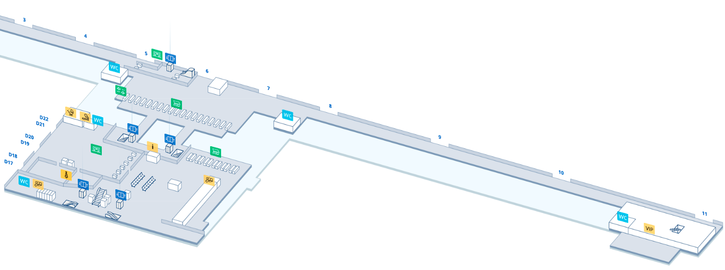 - D – терминал для внутренних и международных рейсов, а также для VIP-пассажиров;