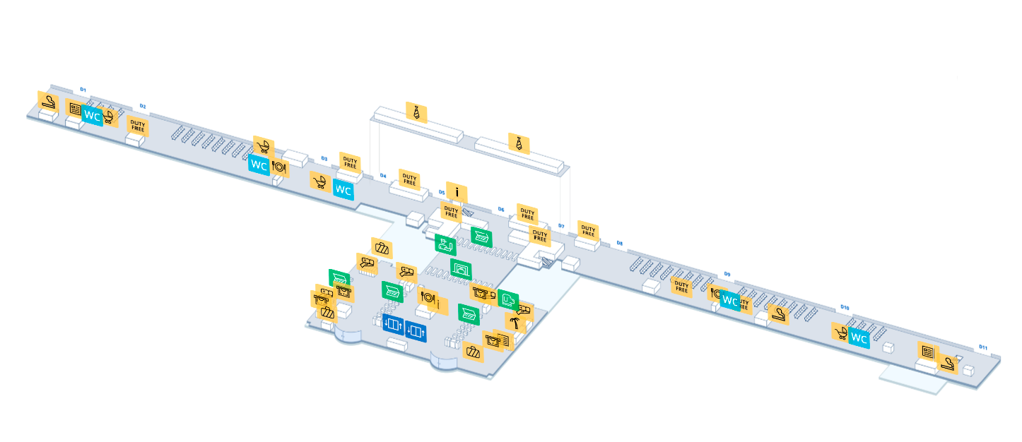 В терминале D есть камера хранения, несколько кафе и магазины Duty Free. Здесь регулярно проводятся художественные выставки. Действует бесплатный wi-fi.