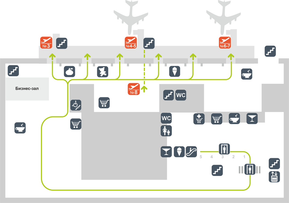 - Бизнес-зал размещен на 2-м этаже Сектора А. В распоряжении пассажиров мягкая и удобная мебель, телефоны, периодическая печать, круглосуточный бар с большим выбором различных напитков и еды. Таможня и погранпереход проходятся индивидуально. Доставка до самолета осуществляется комфортабельным автобусом. Для пассажиров бизнес-класса и собственников бонусных карт обслуживание бесплатное.