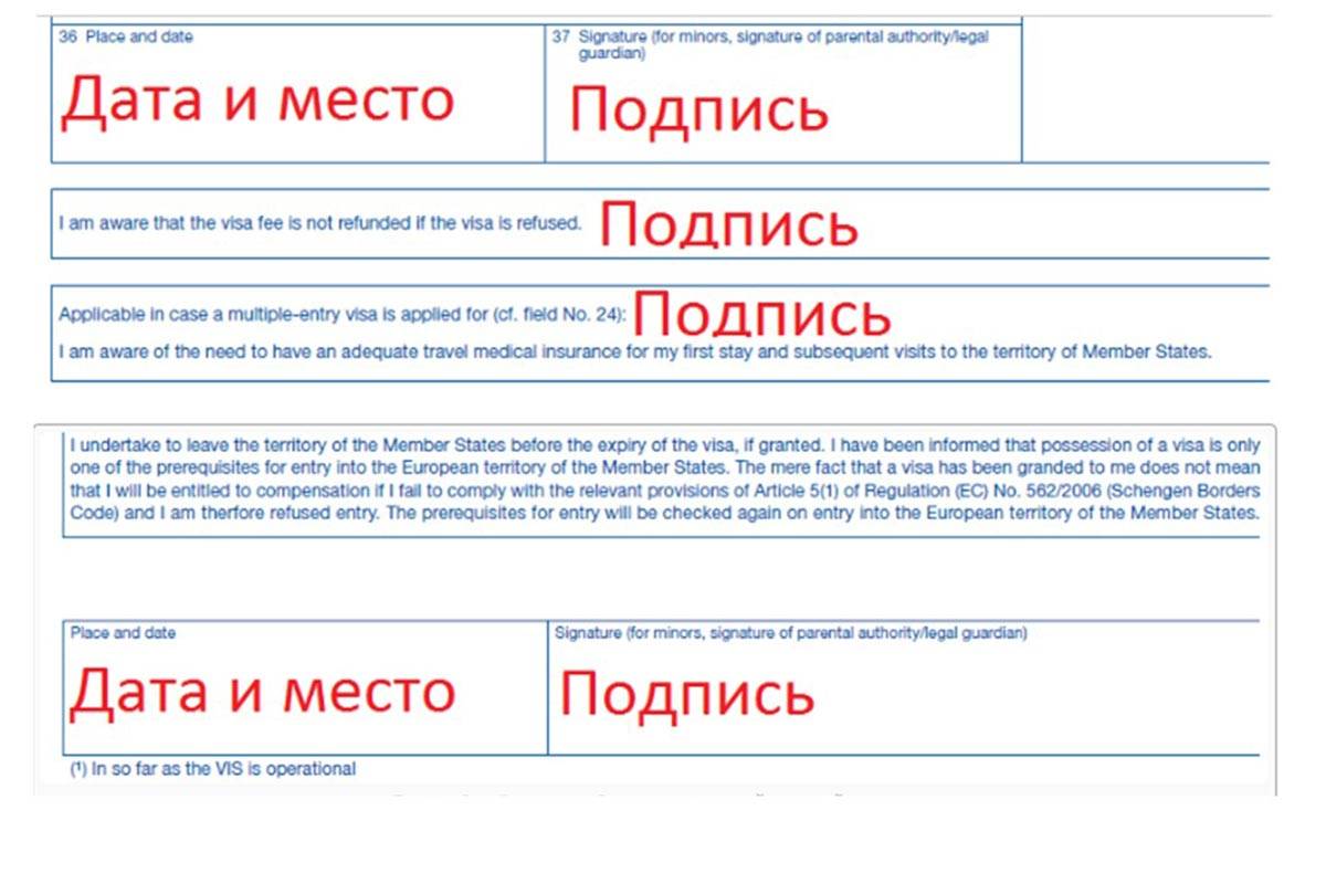 Поставить подпись в пункте №37 и на последней странице внизу. Если запрашивается многократная виза, подписывается пункт о приобретении страхового полиса на все поездки. За детей до 18 лет подписывается законный представитель (мать/отец, опекун, попечитель).