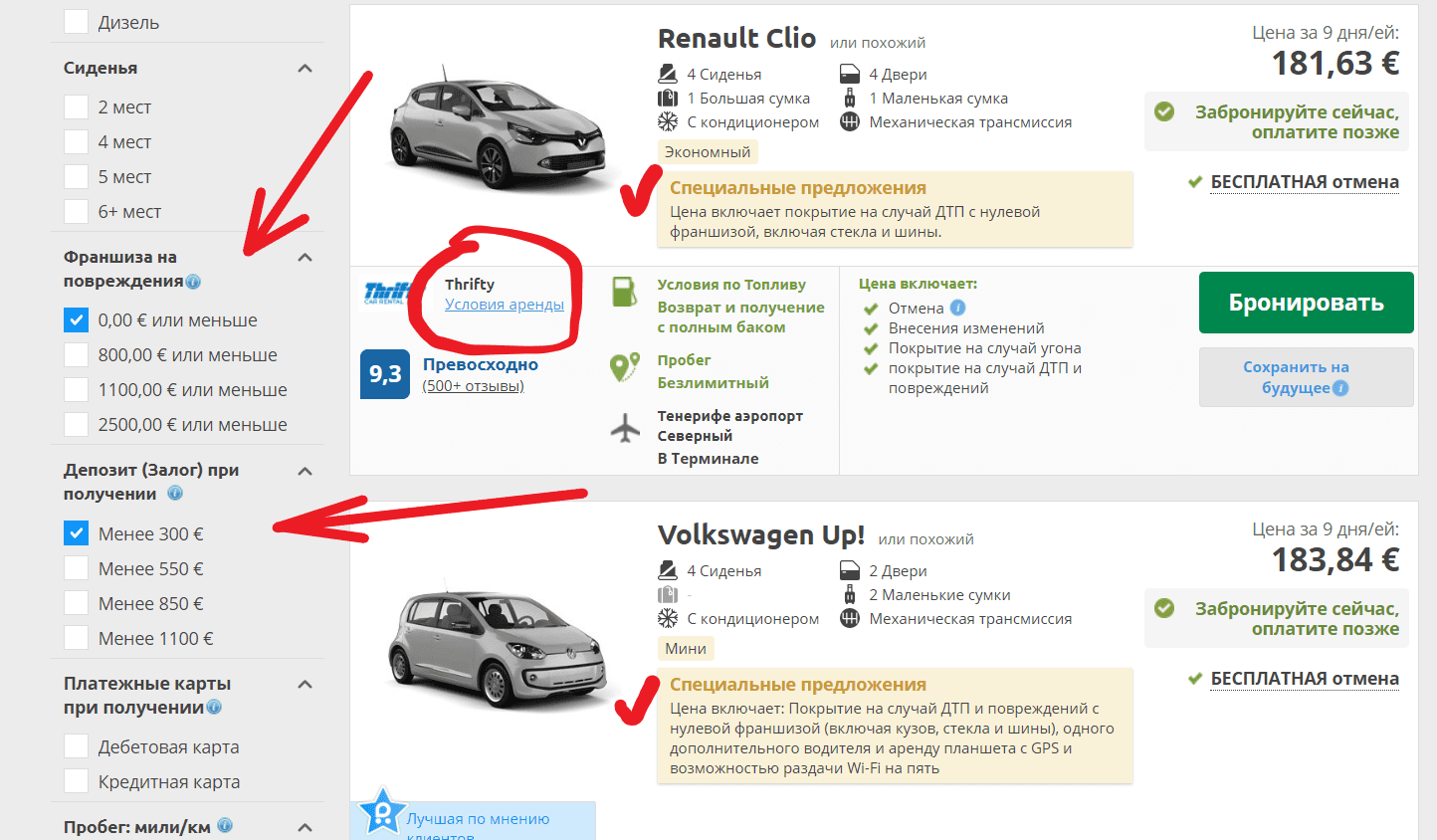 Для этого заходим на Rentalcars и в колонке “Депозит (залог)” ставим галочку напротив минимального варианта “менее 300€” или аналогичная сумма в другой валюте. Теперь система покажет вам только те варианты, где нет депозита или он небольшой. Проверить сумму депозита можно, кликнув “Условия аренды”.