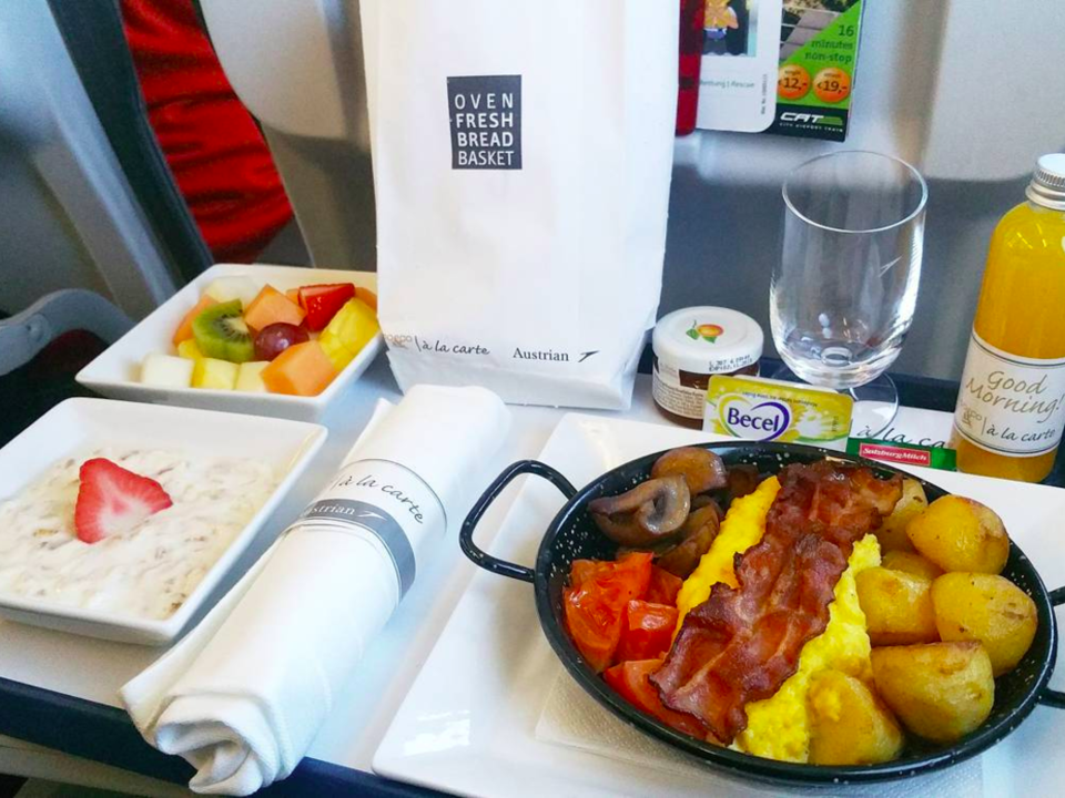 - Эконом-класс континентальный. Предлагается для рейсов длительностью до 2,5 часов. На борту подаются горячие и холодные блюда и легкие закуски. Из напитков предлагается австрийское пиво и вино. Скоротать время в пути помогает свежая пресса и журналы: «Format», «News», «Profil». При желании пассажир может зарезервировать место с увеличенным пространством для ног, услуга стоит 20 евро.