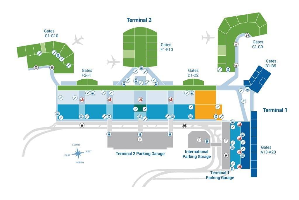 Зоны вылета терминала 1 и терминала 2 будут слева, зоны прибытия – справа. Чтобы добраться до терминала 3, держитесь правее и следуйте указателям, ведущим к зонам высадки и парковке. Езжайте на запад по шоссе Нимиц и поверните налево на бульваре Роджерса.