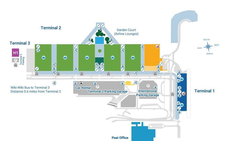 Международный аэропорт имени Дэниела К. Иноуэ включает три терминала. Шаттл Wiki Wiki обеспечивает перемещение пассажиров между билетными кассами трех ангаров и между залами ожидания в терминалах 1 и 2. Схема расположения терминалов приведена ниже.