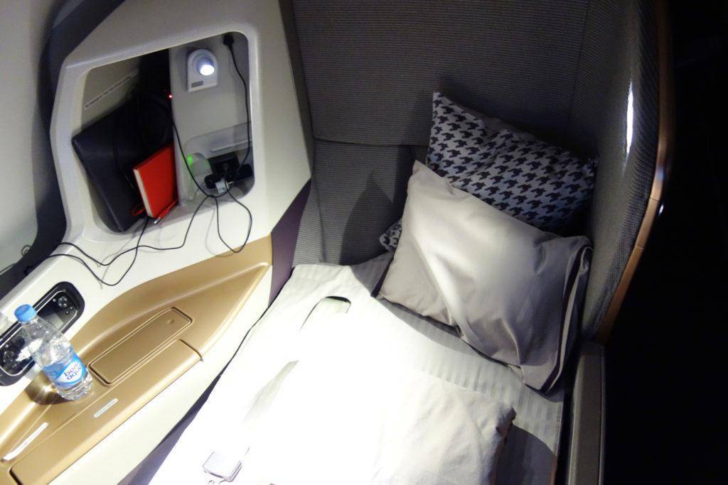 Чтобы не повторяться, я отошлю вас к подробным обзорам бизнес-класса на A350 или B777. Если вкратце, то кресла просто-напросто слишком короткие, а лежа пассажиру приходится принимать диагональное положение. Все это категорически не годится для ночных перелетов (ну, за исключением невысоких людей).