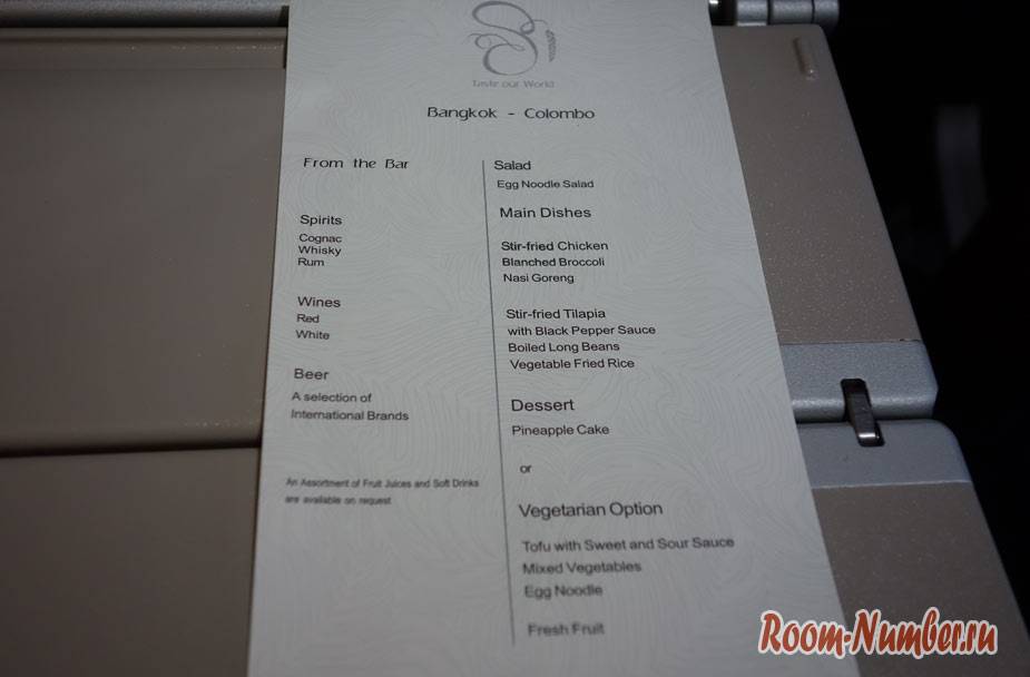 - Чем кормят SriLankan Airlines. Сначала дают на изучение меню с блюдами на выбор. Выбор неплохой: рыба, курица, рис с овощами, вермишель, тофу, маленький кусочек тортика. Кормят нормально, есть даже еда для вегетарианцев.