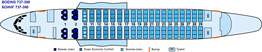 С 10 по 29 ряд – класс эконом. Пассажирские кресла расположены в два ряда в компоновке 3х3. В конце салона находится туалетная комната.
