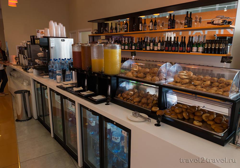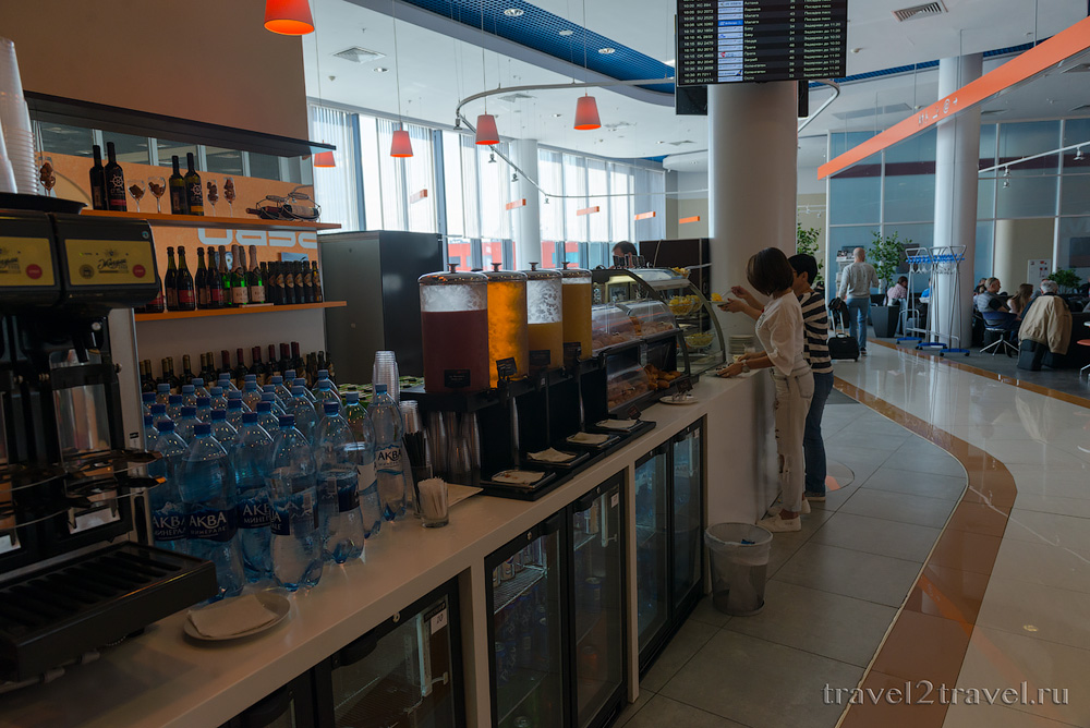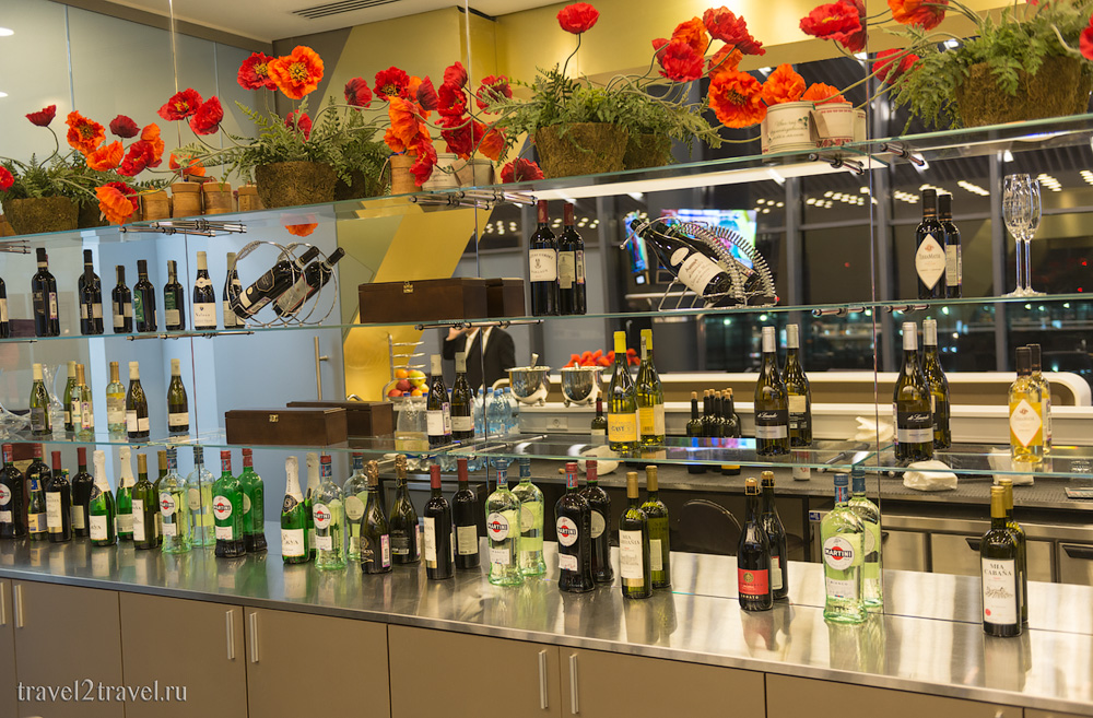 К услугам владельцев карт Priority Pass (и других статусных карт) бесплатный алкоголь (мартини, шампанское и вино), а также приличный выбор закусок — салаты, пирожки, колбасы и т.п.