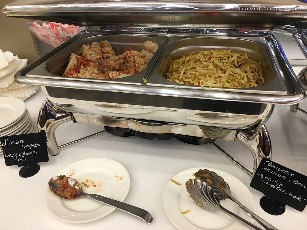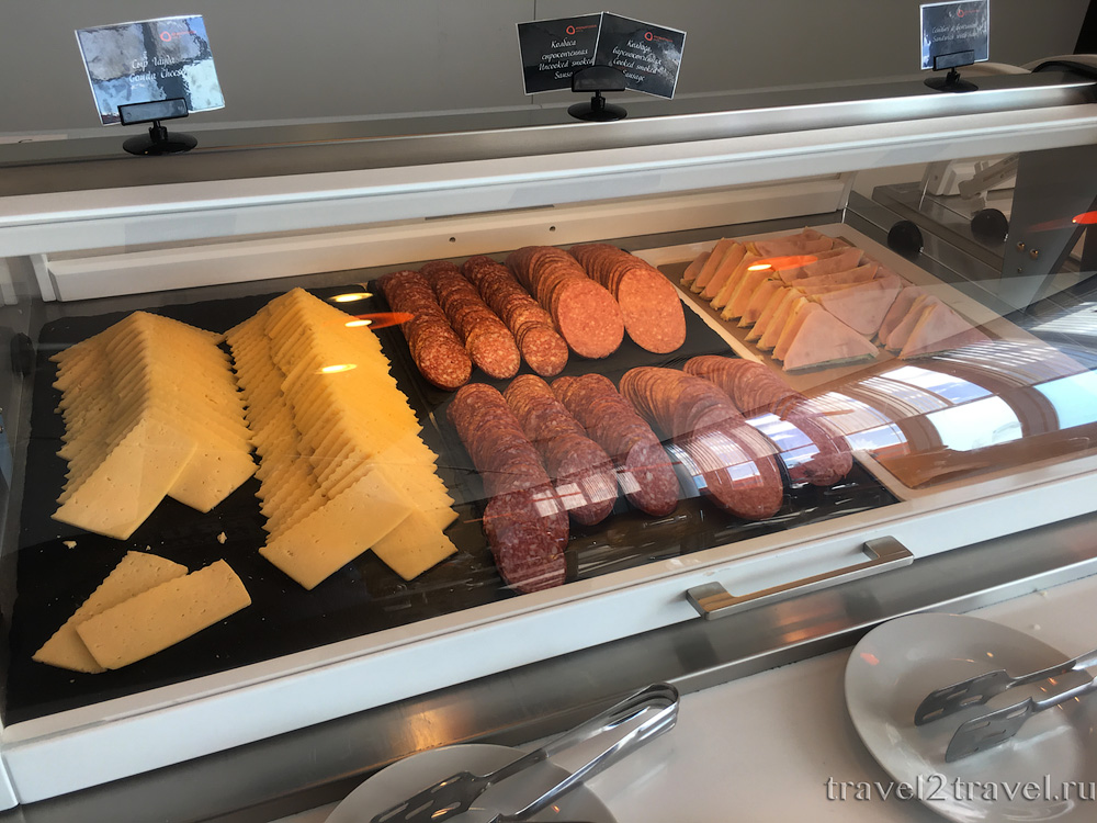 Не понятно зачем понадобилось 3 вида копченой колбасы. Могли бы вместо одного сорта колбасы предложить ветчину из курицы или индейки. Хорошо, что среди предложенного ассортимента оказался сыр, который несколько скрасил отсутствие подходящего питания. Вегетарианские макароны не понравились. Блюдо явно относится к горячим, но по факту таковым не являлось.) Блины, которые составили наш основной рацион в этом бизнес-зале, так же оказались холодными, как будто их держали в холодильнике.