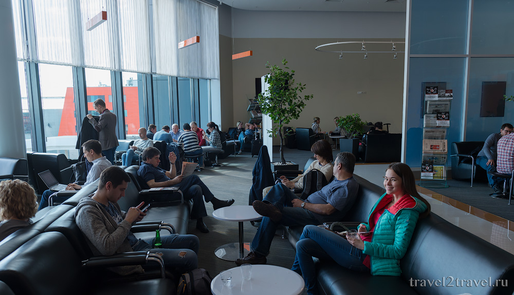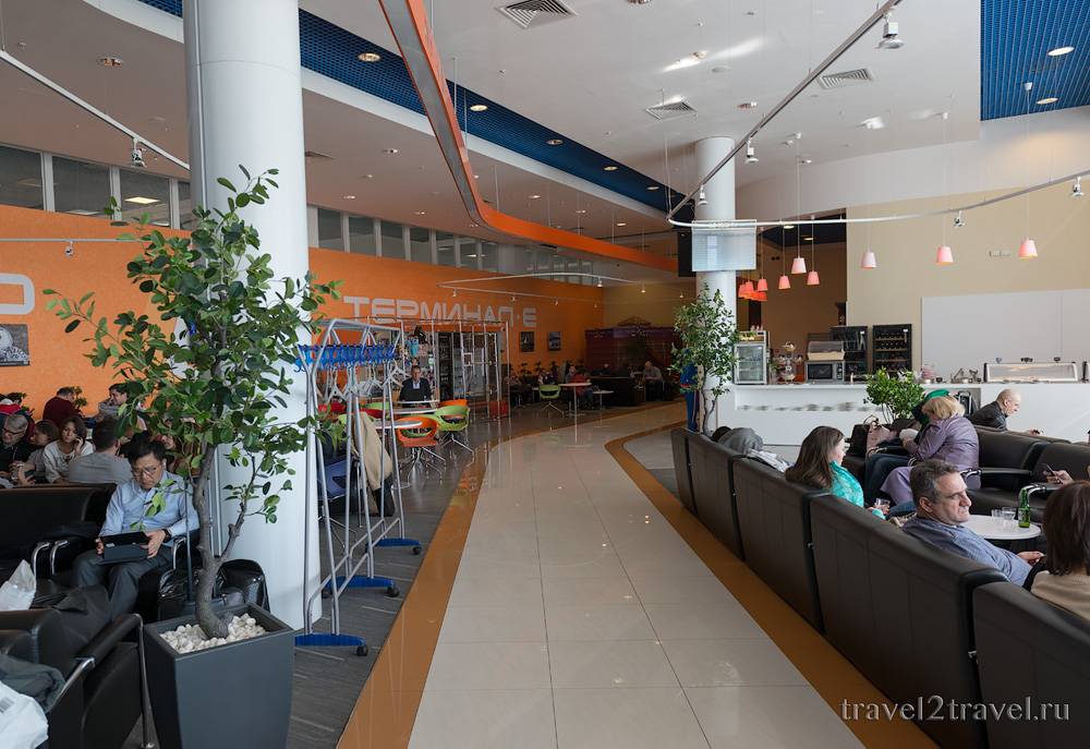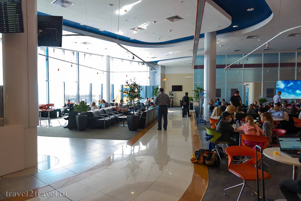 Источник фото: travel2travel.ru, блог «Space Lounge». Еще один зал для людей, летящих за границу. Стильный дизайн интерьера сразу привлекает гостей. Зоны отдыха удобно расположены у панорамных окон. Несмотря на то, что холл большой, пространство спроектировано так, что легко найти тихий уголок. На территории есть игровая площадка для детей.