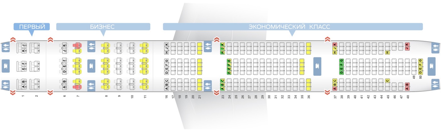 Места A, B, J, K в 48-м ряду лучше не выбирать никому, так как перед ними, под креслами 47-го ряда монтируют серверы бортовых развлечений.