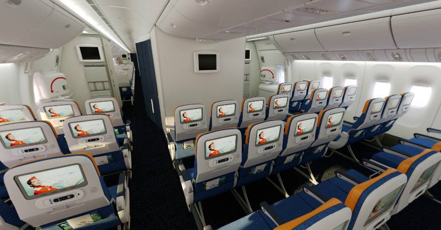 - Эконом-класс. Занимает основную часть салона и располагается сразу за классом комфорт. Здесь могут расположиться 324 пассажира.