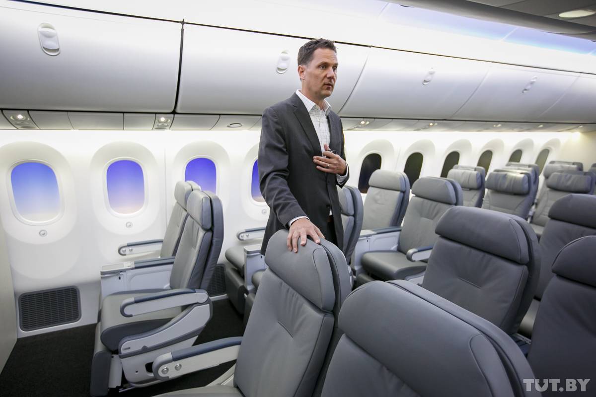 Представитель «Боинга» проводит экскурсию по салону-макету.