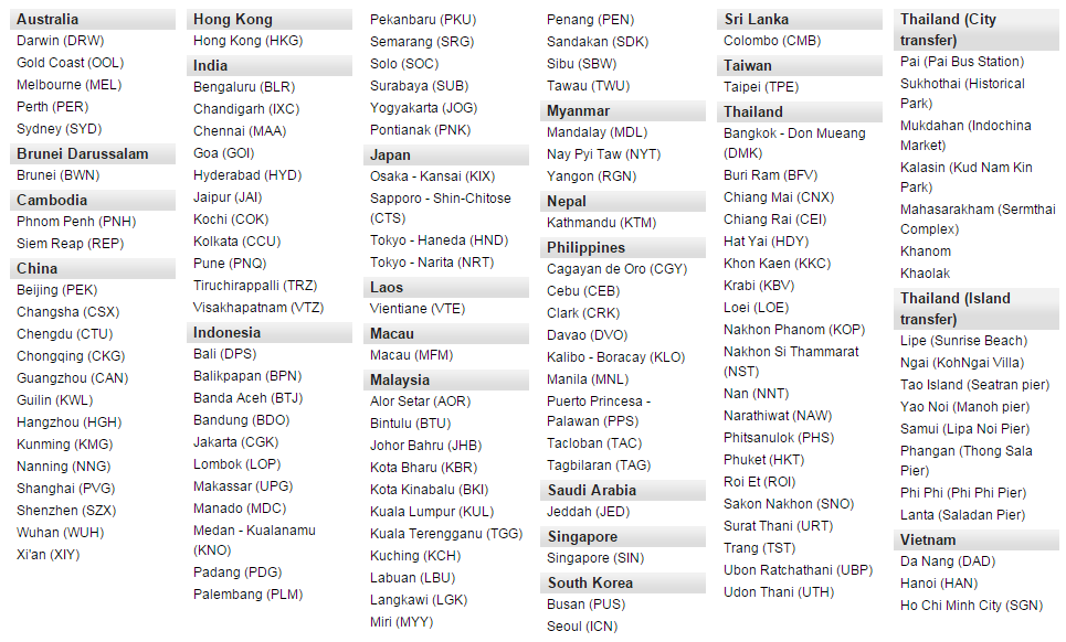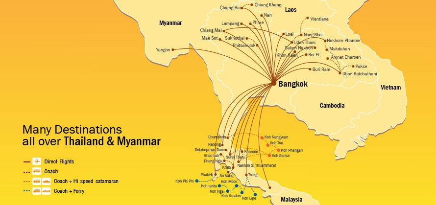 Воздушный перевозчик занимается обслуживанием как местных бюджетных авиаперелетов по территории Таиланда, так и обслуживает рейсы международного значения. Воспользовавшись услугами данной авиакомпании, пассажиры смогут добраться до следующих мест: