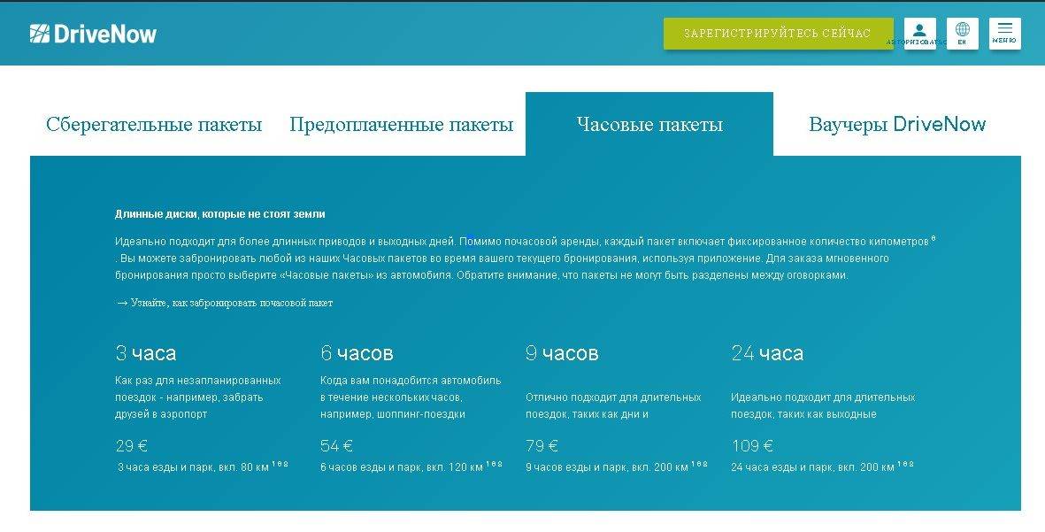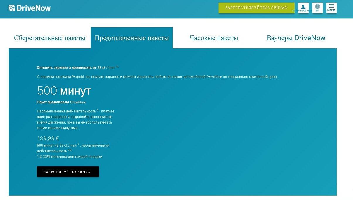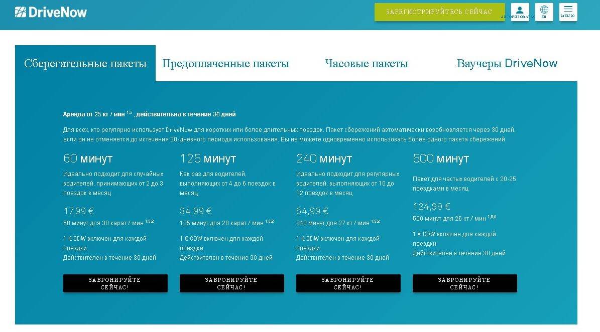 Кроме поминутной аренды «DriveNow» позволяет пользоваться 4 типами пакетов аренды: