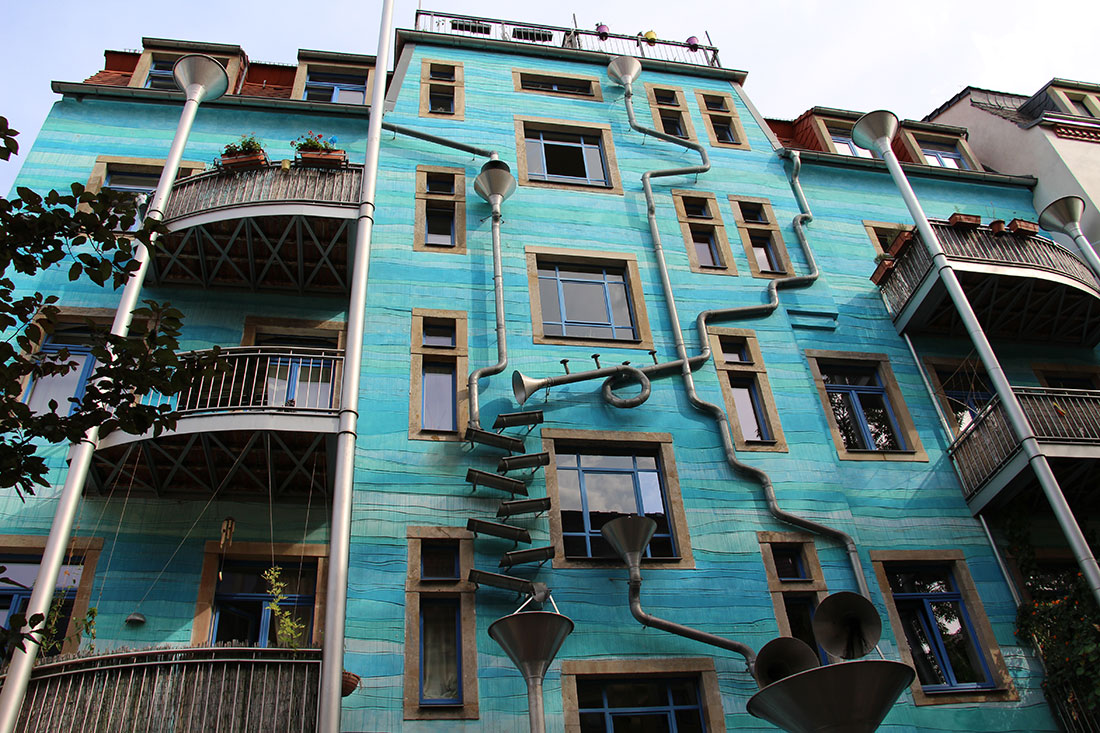 Кунстхофпассаж – это пять красочных двориков в Нойштадте, студенческом районе Дрездена. Прогуливаясь по Пассажу, можно увидеть колоритные дворы с авангардными фасадами зданий. Один из наиболее известных – так называемый «Двор стихий». Сине-голубые фасады его домов имеют яркую особенность – «поющие» наружные водосточные трубы.