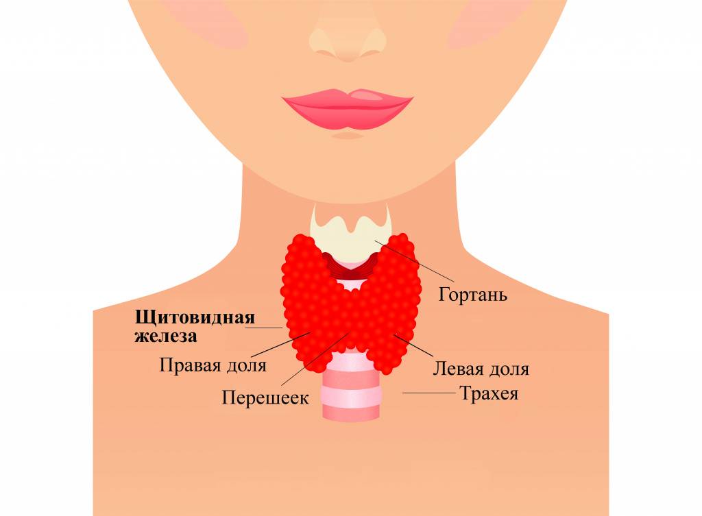 Железа находится в передней части шеи, имеет форму бабочки, а ее левая и правая доли соединены узкой полоской ткани – перешейком. У большинства людей она не заметна и даже не прощупывается.