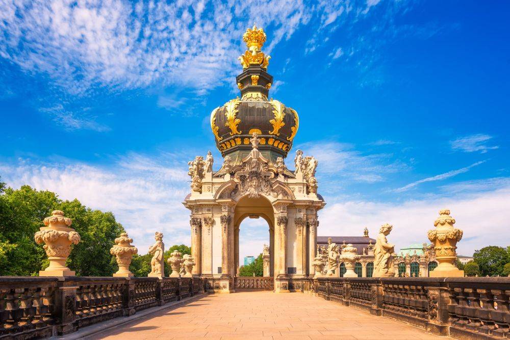 У входной арки – конная статуя создателя Цвингера, курфюрста Августа II. Входная арка – Коронные ворота – необычной архитектуры: соединение надвратной башни и двухъярусной триумфальной арки. Купол венчает позолоченная польская корона – атрибут власти Августа Сильного, которую поддерживают четыре позолоченных орла. Окружают купол 8 скульптур в человеческий рост.
