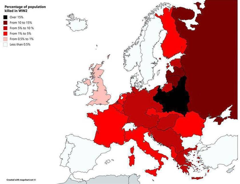Доля жителей стран Европы, убитая во Второй мировой войне.