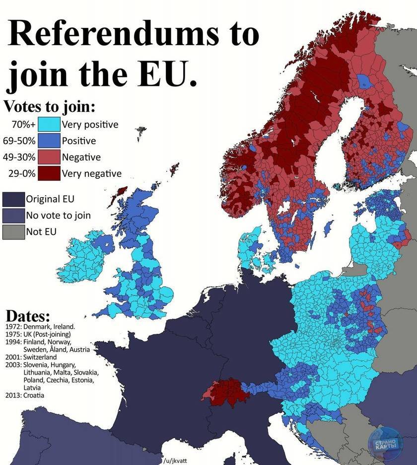 Отношение к присоединению стран к Евросоюзу по округам на референдумах с 1972 по 2013 гг