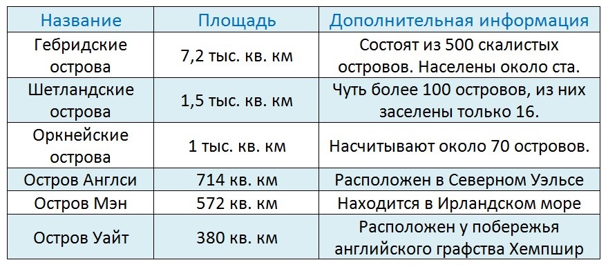 Во-первых, Соединенное Королевство раскинулось на островах Британского архипелага, полностью занимает один из двух больших островов — Великобританию, и северную часть другого — Ирландии. В состав государства также входят более 5 тысяч небольших островов: Гибридские, Шетландские, Оркнейские и другие.