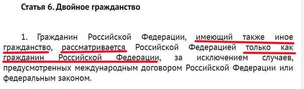 Россиянин, имеющий несколько гражданств, признается в РФ только как гражданин РФ, выдержка из статьи 6 ФЗ “О гражданстве РФ”