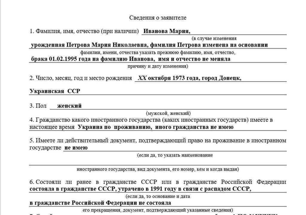 Сведения , пункты в заявлении по Указу составляются также, как в основной анкете на гражданство. Информацию по их заполнению вы найдете выше в статье. На фото вы можете посмотреть образец того, как выглядят данные пункты в анкете для ДНР.
