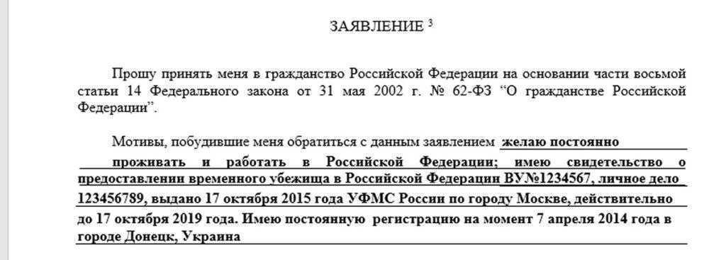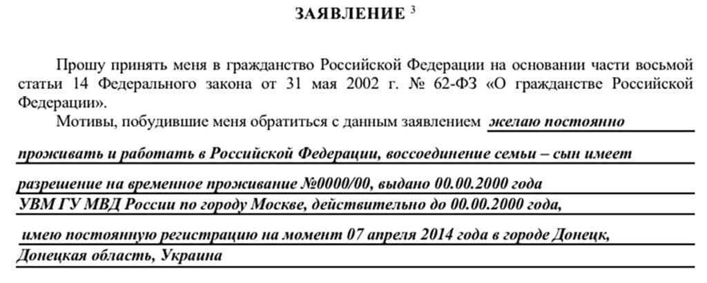 Родственники, которые идут «прицепом» в этом разделе пишут «желаю постоянно проживать в Российской Федерации, воссоединение семьи – сын (дочь, мать, отец, муж, жена) имеет вид на жительство (разрешение на временное проживание, временное убежище и т.д.)…». Далее записываются данные статуса — кем, когда выдан, срок действия. В конце добавляете, что родственник, по которому подаете, имеет регистрацию в Донецкой или Луганской области на 7 или 27 апреля 2014 года соответственно.