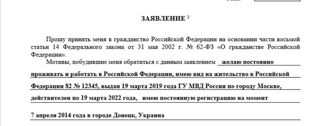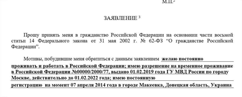Оформляющийся по 187 Указу гражданин в разделе «мотивы» пишет: «желаю постоянно проживать и работать в Российской Федерации». Здесь же добавьте, какой статус имеете в России (РВП, ВНЖ, временное убежище и т.д.), напишите дату, орган выдачи, срок действия статуса. В мотивах также нужно написать, что вы имеете постоянную регистрацию на 7 апреля 2014 года (для ДНР) или на 27 апреля 2014 года (для ЛНР). Также нужно добавить, в каком именно населенном пункте была прописка на указанные даты. Образцы смотрите на фото.
