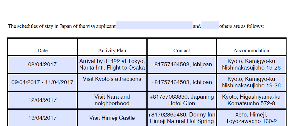 - подробная программа пребывания в Японии (также на одном их двух языков – английском или японском) – указываются крайние даты (день приезда – день отъезда), предполагаемые маршруты передвижения по стране, номера «входящего» и «исходящего» авиарейсов и прочие «явки-пароли» вроде адресов и телефонов отелей в Японии, в которых планирует останавливаться соискатель.