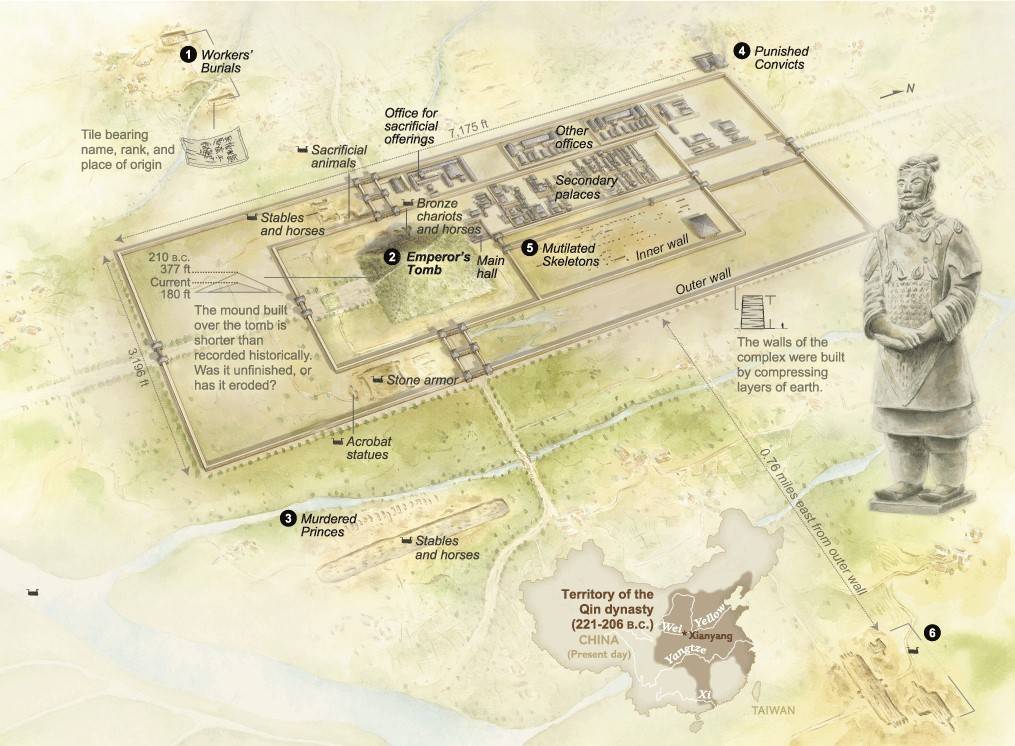 Под 6 метровым слоем глины, помимо терракотовой армии, вместе с императором, были заживо погребены десятки тысяч чиновников, императорских слуг, различных ремесленников и несколько десятков его наложниц.