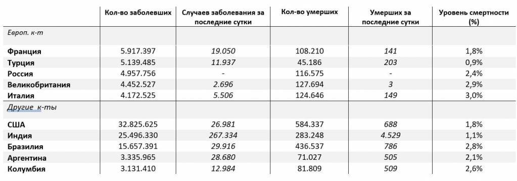 Статистика заболевания коронавирусом в Европе и в мире на 20.05.2021. Страны с наибольшим количеством заболевших.