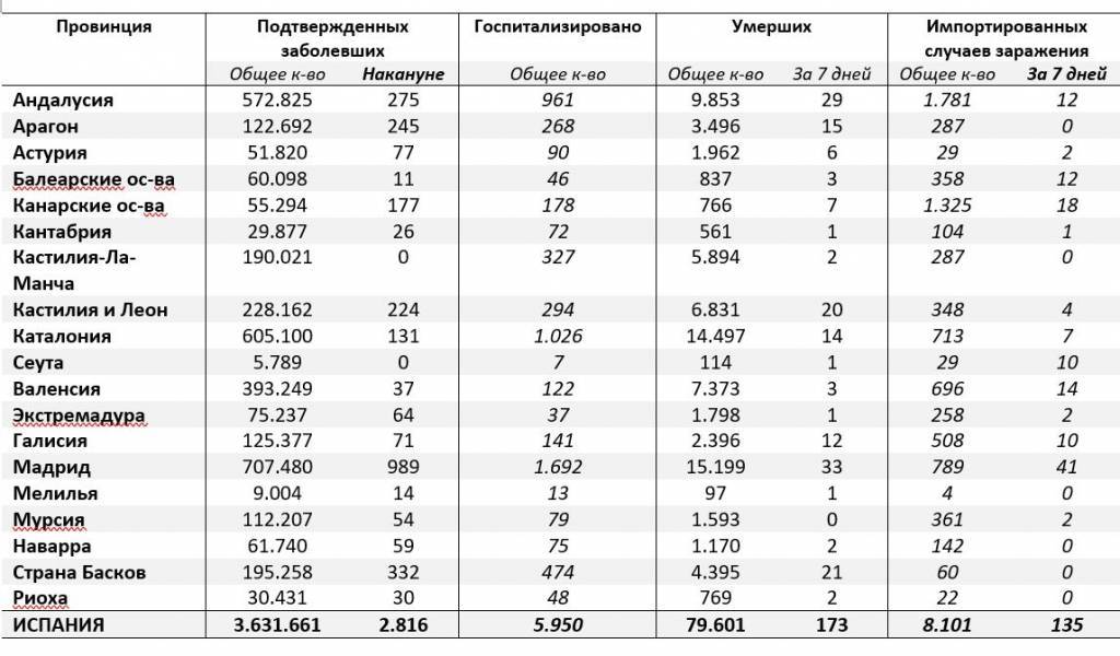 | В Испании зарегистрировано:3.631.661 зараженных коронавирусом COVID-19; 79.601 умерших; 2.816 заболевших накануне. | 2% – по всему миру (165 млн заболевших, 3,43 млн умерших);9,3% – Мексика; 4,6% – Китай; 3,5% – Перу, Южная Африка;3% – Италия; 2,9% – в Великобритании; 2,4% – в России;2,2% – в Испании;1,8% – во Франции; 1,8% – США. |