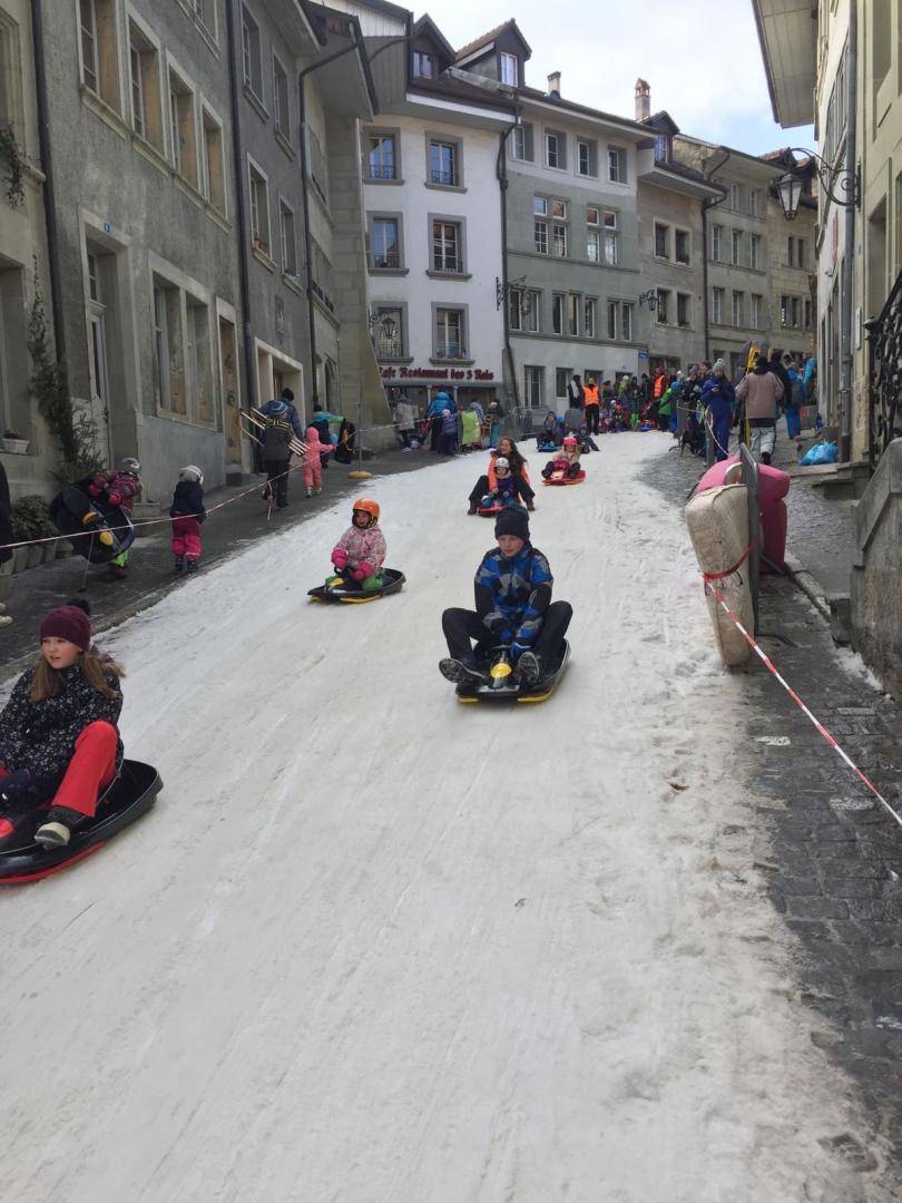 Январь — катание на санках в старом городе Фрибура. Начало трассы на rue de la Samaritaine, а конец на Place du Petit-St-Jean.