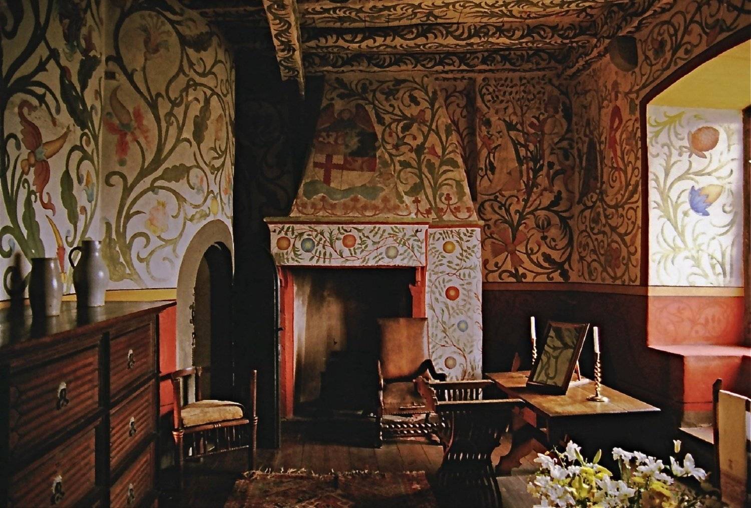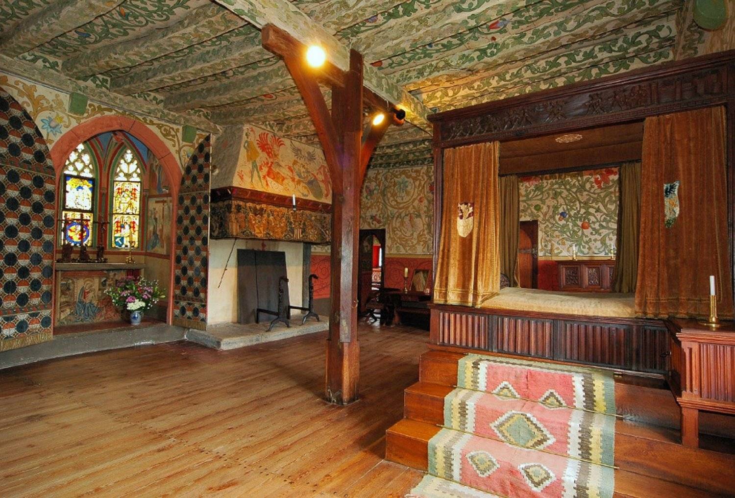 Отметим также, что в многих залах и комнатах есть эксклюзивные детали интерьера, например, знаменитый деревянный потолок пятнадцатого века, который украшает нижний зал – наследие семьи Рюбенах. Здесь же можно насладиться великолепной фреской в одной из спален. Работа датируется 1470 годом.