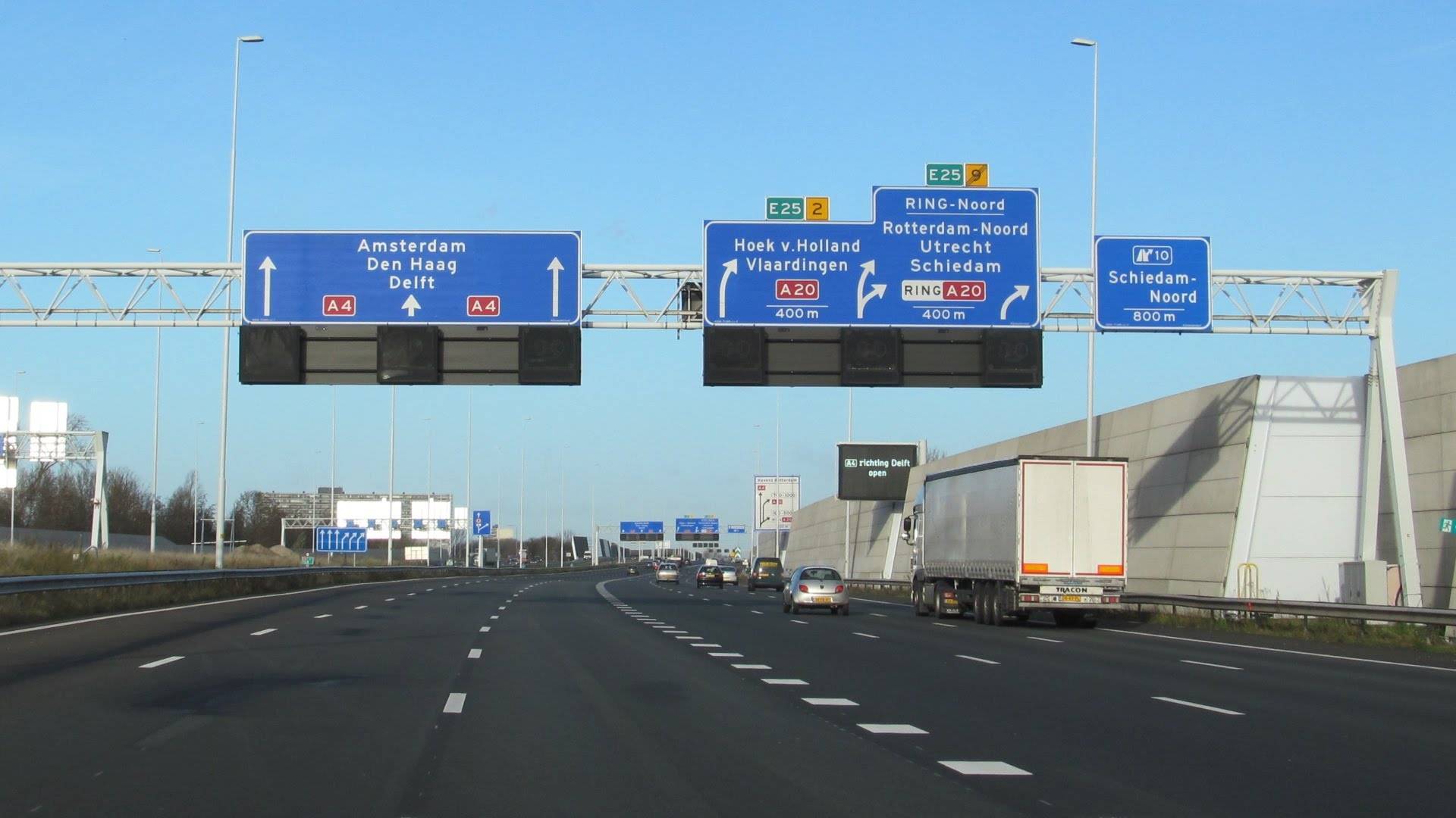 Между Амстердамом и Гаагой проходит автомобильная дорога А-4. Маршрут следует проектировать так, чтобы выехать из столицы именно на эту трассу, которая имеет несколько полос движения в одну сторону и разделитель, оберегающий водителей от лобового столкновения.