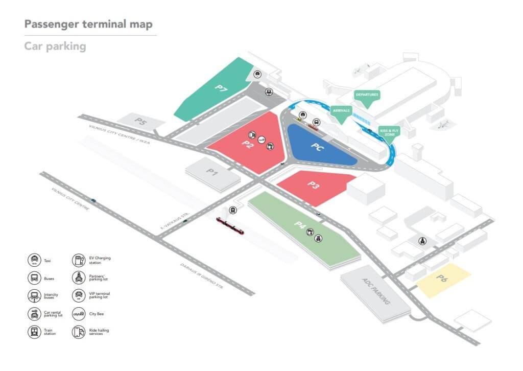 Посмотреть схему парковок аэропорта Вильнюса, их стоимость, а также возможность забронировать парковку онлайн можно здесь.