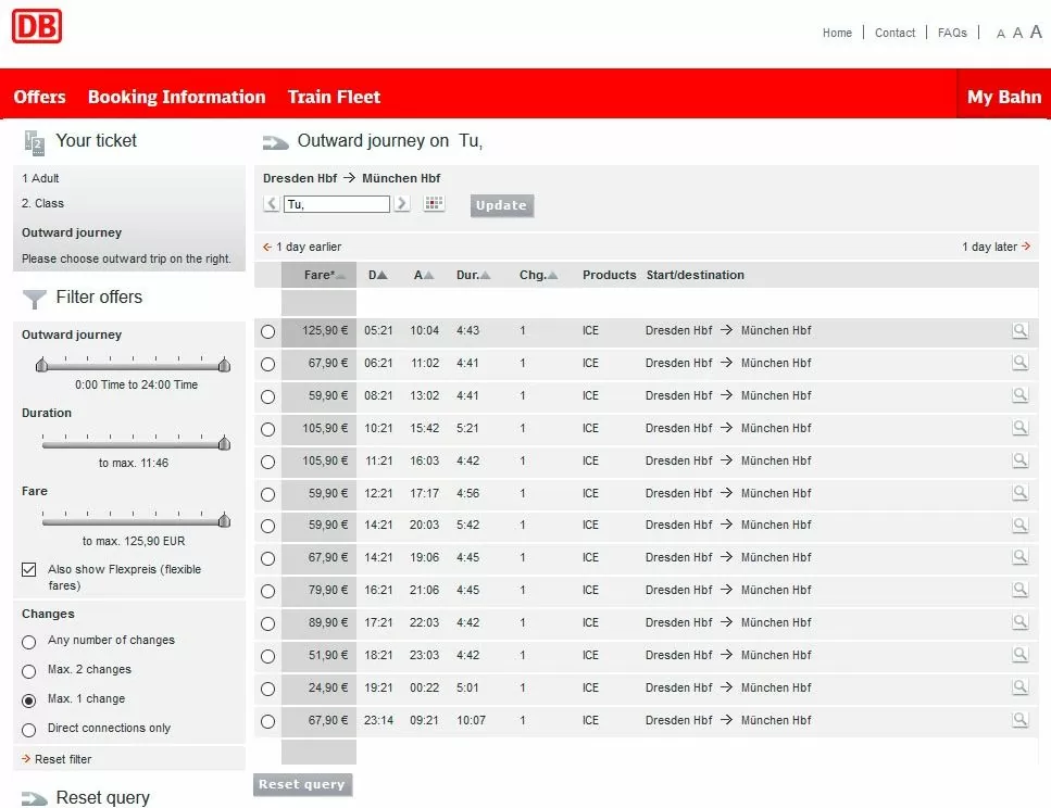 Существует множество маршрутов, и есть возможность подобрать вариант только с 1 пересадкой. Можно отправиться с вокзала Dresden Hbf, пересесть на станции Hof Hbf и доехать до вокзала München Hbf. Общее время в пути займет 7 ч. 16 мин, а стоимость такого маршрута составит 85–130 €, в зависимости от выбранного тарифа.