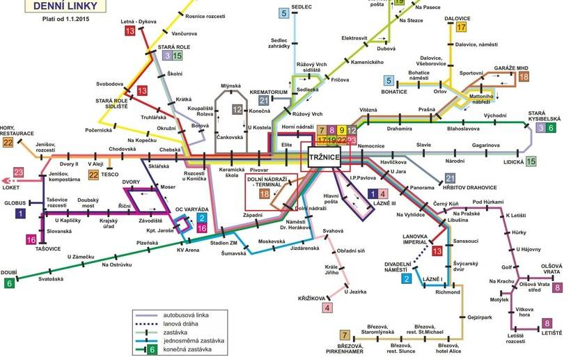 Автобусы в Карловых Варах ходят строго по расписанию, а самая центральная остановка – Tržnice- находится на Рыночной площади. Все автобусные маршруты расходятся «лучиками» от этой остановки. Для наглядности смотрите карту (кликабельно)