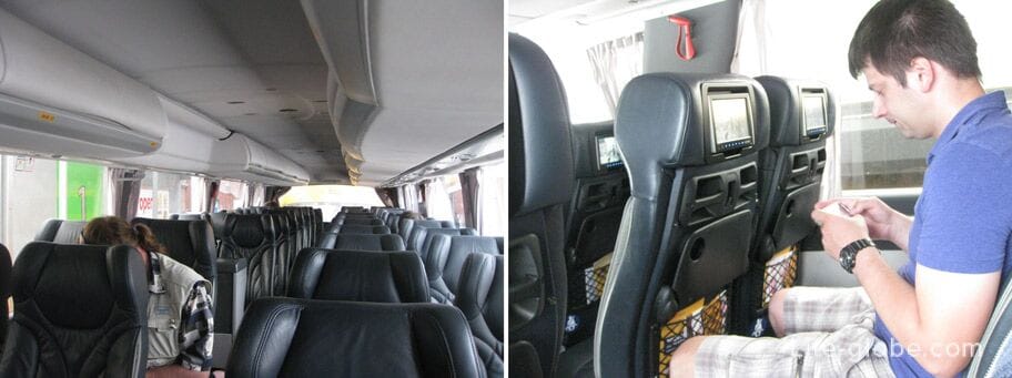 Внутри автобусы оснащены большими кожаными креслами, кондиционером, туалетом, розетками 220 V, и мониторами, встроенным в спинки сидений. Можно поиграть в игры, послушать музыку или посмотреть кино. В пути вам также бесплатно предложат горячие напитки, газеты и наушники. Работает wi-fi, причем ловит отменно на протяжении всего пути.