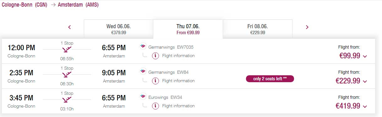 Преимущественно перелёты совершаются утром и днём. Первый рейс с пересадкой вылетает из аэропорта Кельн-Бонн в 5.55 и прибывает в Схипхол в 9.20. Самый последний приходится на 16.35, а через 4 часа 15 минут он прибывает в амстердамский аэропорт.