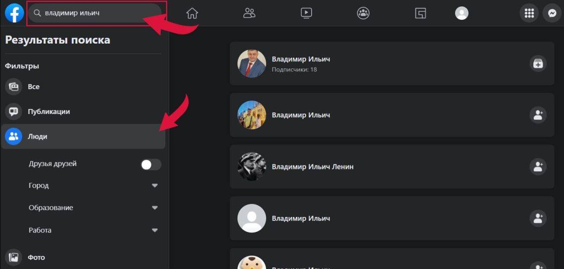 В Facebook поле поиска расположено слева вверху. Введите туда имя и фамилию и нажмите Enter. Возможно, в выдаче будут отображены не только пользователи, потому в том же левом столбце выберите вкладку «Люди». Если уверены, что у вас есть общие знакомые, переключите тумблер поиска, чтобы система выдавала только друзей ваших друзей. Прочих фильтров ровно три: