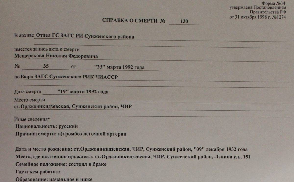 Справка о смерти по форме №34 (старого образца) Мещерякова Николая Федоровича