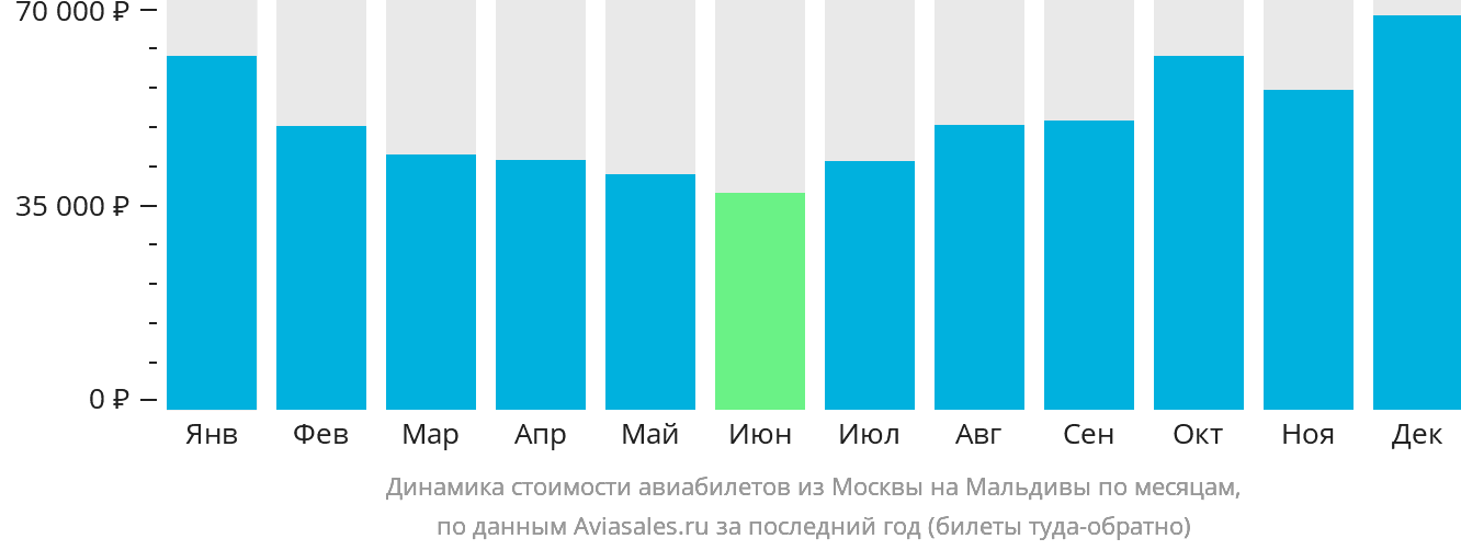 Стоимость перелёта всегда зависит от времени путешествия. График позволит сравнить цены на авиабилеты из Москвы на Мальдивы, проследить динамику изменения их стоимости и найти оптимальное предложение.