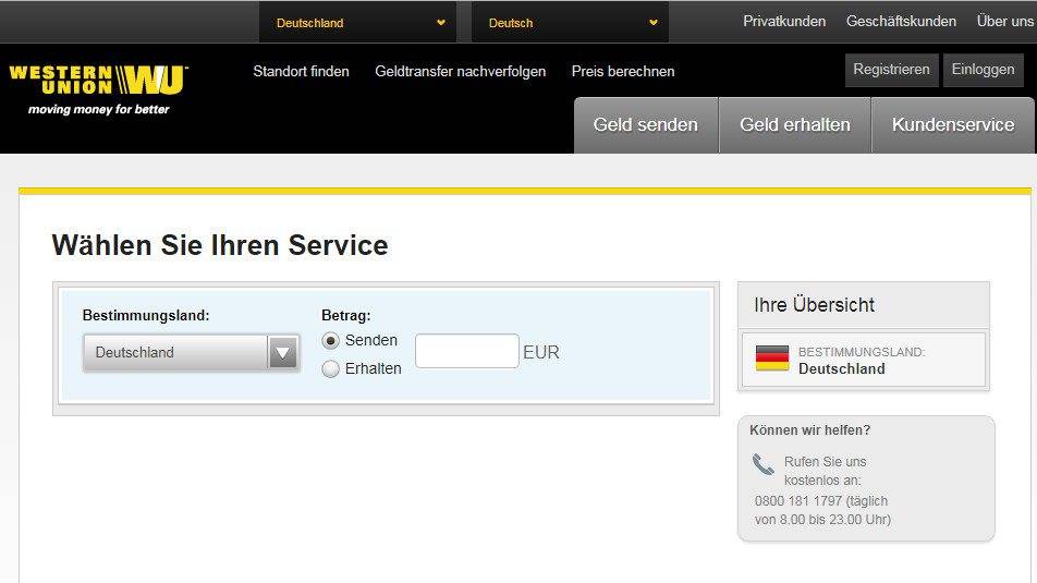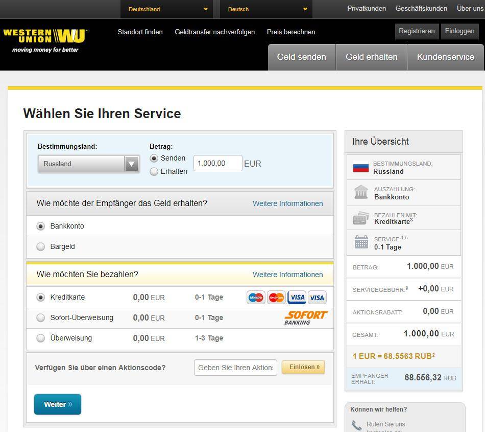 Однако большинство людей сегодня предпочитает пользоваться интернетом и проводить платежи не выходя из дома в любое время суток. Чтобы сделать онлайн перевод из Германии в Россию, необходимо зайти на официальную страницу переводов Вестерн Юнион: