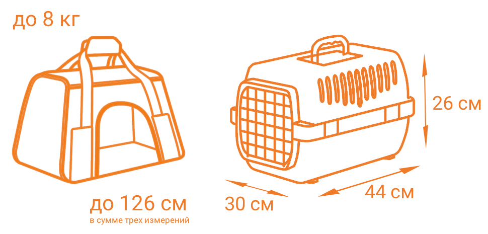Размер мягкой сумки-переноски для перевозки в пассажирском салоне в сумме трех измерений не должен превышать 126 см. Если размер контейнера превышает установленную норму, то перевозка будет осуществляться в багажном отсеке.