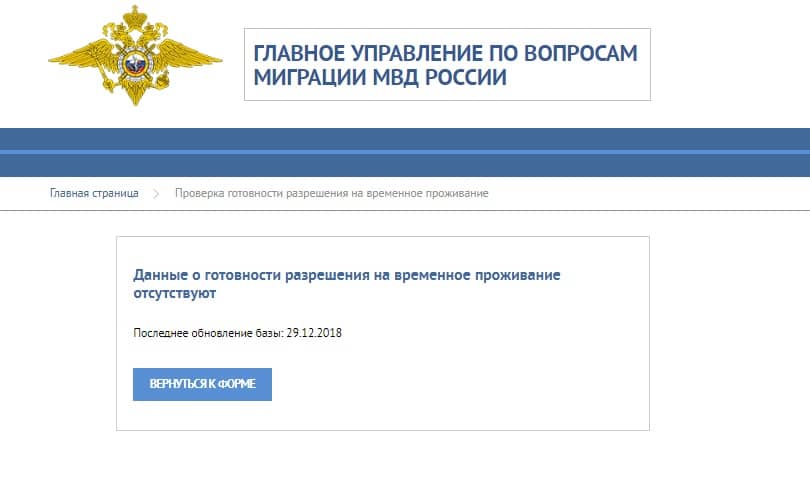 Откроется новая страница, на которой вы узнаете о статусе своего заявления. Например, если РВП не готово, то появится сообщение: «Данные о готовности разрешения на временное проживание отсутствуют».